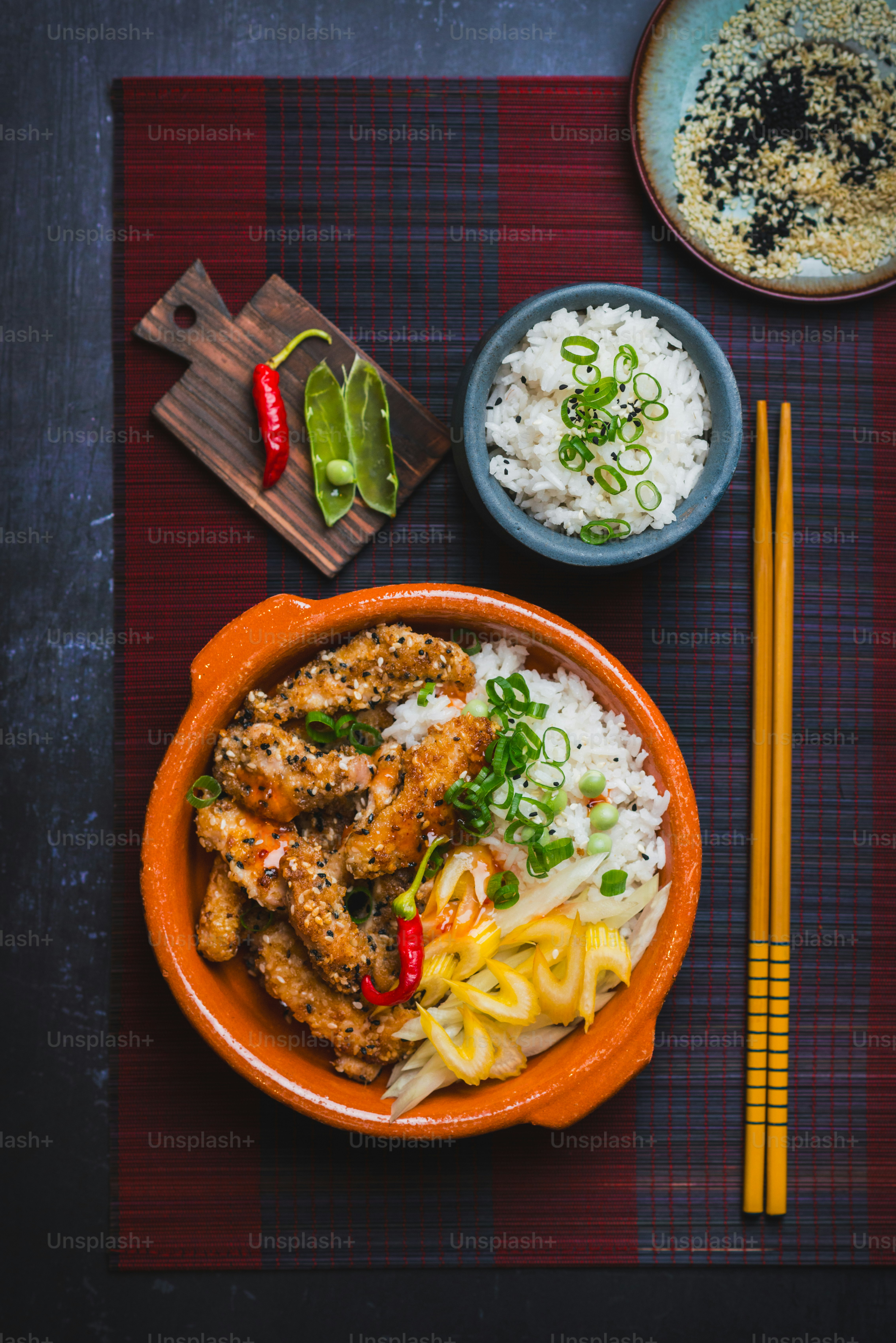 Chicken, White Rice, Broccoli, Carrots, Teriyaki Sauce, Sesame Seeds, Ginger